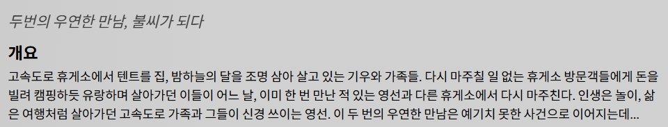 movie 영화 고속도로 가족 휴게소에 고속도로 가족 "휴게소에 텐트 치고 사는 가족의 비밀! 낯선 친절이 불러온 독한 비극과 새로운 희망의 기록" persongg*** calendar_today2026.04.25 visibility6,716 download 다운로드 1개 파일 folder_zip 고속도로 가족.mkv 1.4 GB download