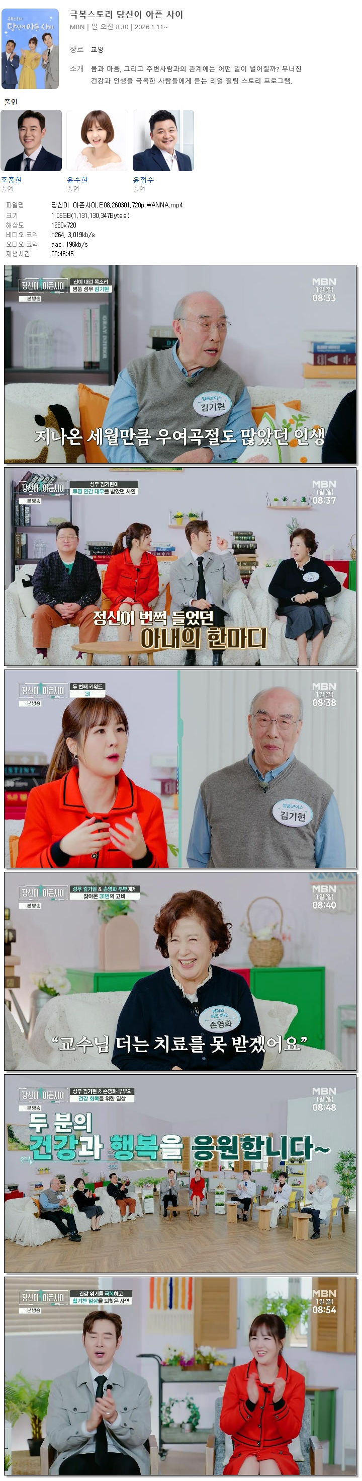 cast 동영상 당신이 아픈사이E08260301720pWANNA 당신이 아픈사이.E08.260301.720p.WANNA person바오*** calendar_today2026.01.01 visibility3,040 download 다운로드 1개 파일 folder_zip 당신이 아픈사이.E08.260301.720p.WANNA.mp4 1.1 GB download