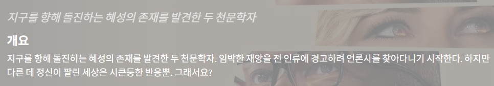 movie 영화 지구를 향해 돌진하는 돈 룩 업 "지구를 향해 돌진하는 혜성의 존재를 발견한 두 천문학자" persongg*** calendar_today2026.04.23 visibility6,635 download 다운로드 1개 파일 folder_zip 돈 룩 업 (자체자막).mkv 2.4 GB download