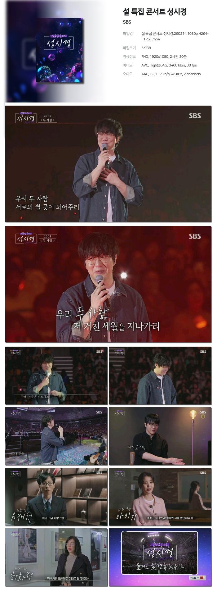 cast 동영상 설특집 콘서트 성시경2602141080pH264 설특집 콘서트 성시경.260214.1080p.H264-F1RST person켓츠*** calendar_today2026.01.01 visibility5,860 download 다운로드 1개 파일 folder_zip 설 특집 콘서트 성시경.260214.1080p.H264-F1RST.mp4 3.9 GB download