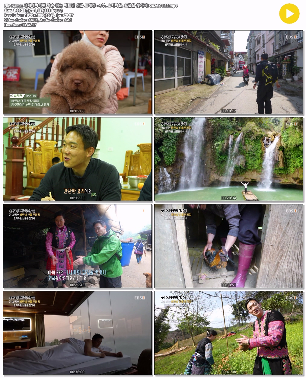 cast 동영상 세계테마기행 가슴 뛰는 세계테마기행 가슴 뛰는 베트남 산골 트레킹 - 3부. 오지마을, 보물을 찾아서! 2026.04.22 persontm*** calendar_today2026.04.22 visibility7,401 download 다운로드 1개 파일 folder_zip 세계테마기행 가슴 뛰는 베트남 산골 트레킹 - 3부. 오지마을, 보물을 찾아서! 2026.04.22.mp4 1.7 GB download