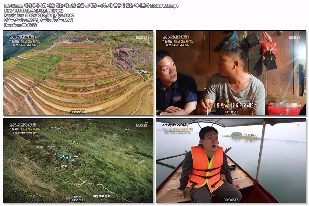 cast 동영상 세계테마기행 가슴 뛰는 세계테마기행 가슴 뛰는 베트남 산골 트레킹 - 4부. 내 친구의 집은 어디인가 2026.04.23 personhe*** calendar_today2026.04.23 visibility5,983 download 다운로드 1개 파일 folder_zip 세계테마기행 가슴 뛰는 베트남 산골 트레킹 - 4부. 내 친구의 집은 어디인가 2026.04.23.mp4 1.6 GB download