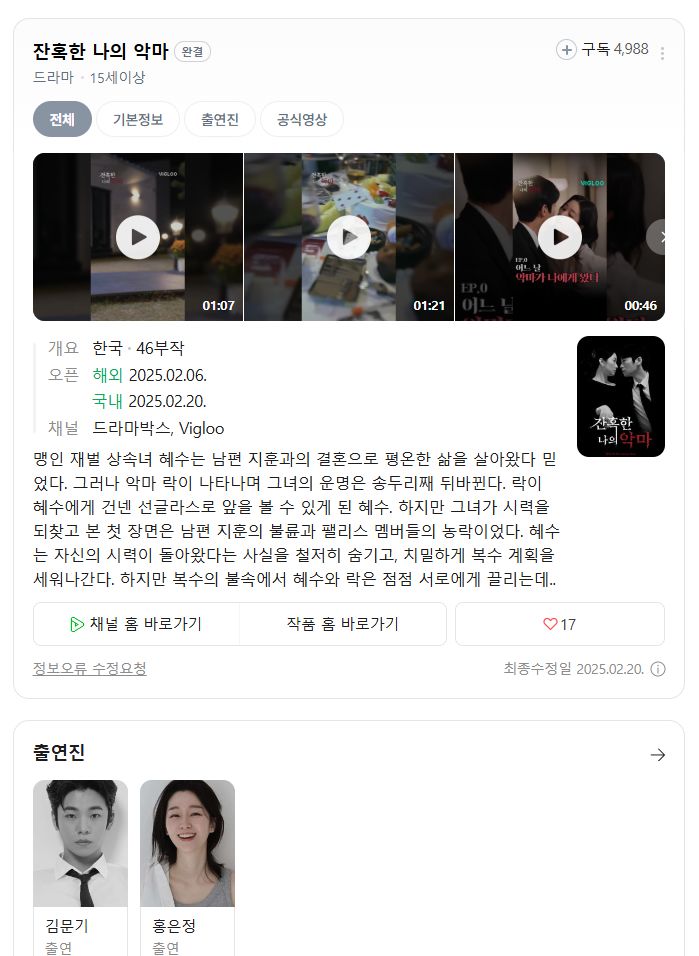 live_tv 드라마 숏폼 한드 완결 [숏폼 한드 완결] 잔혹한 나의 악마 1부작 통합.2025.506p.TVING.WEB personro*** calendar_today2026.04.25 visibility4,154 download 다운로드 2개 파일 folder_zip 잔혹한 나의 악마.TVING.WEB-DL.506p.H.264.AAC2.0.mkv 1.2 GB download folder_zip 잔혹한 나의 악마.TVING.WEB-DL.506p.H.264.AAC2.0.srt download