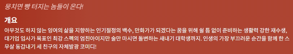 movie 영화 스물 뭉치면 터지는 스물 "뭉치면 빵 터지는 놈들이 온다!" persongg*** calendar_today2026.04.21 visibility6,580 download 다운로드 1개 파일 folder_zip 스물.mkv 2.5 GB download
