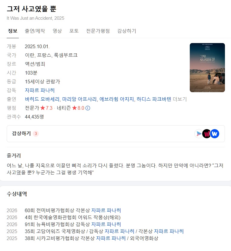 movie 영화 업로더 그저 사고였을 업로더 [[ 그저 사고였을 뿐 2025 ]] 1080P 블루레이 personne*** calendar_today2026.04.22 visibility5,592 It.Was.Just.An.Accident.2025.Hybird.1080p.BluRay.DDP5.1.x264-ZoroSenpai로그인 후 '업로더' 검색하시면 더욱 많은 자료가 있습니다.많은 이용 부탁드립니다. download 다운로드 2개 파일 folder_zip It.Was.Just.An.Accident.2025.Hybird.1080p.BluRay.DDP5.1.x264-ZoroSenpai.mkv 12.6 GB download folder_zip It.Was.Just.An.Accident.2025.Hybird.1080p.BluRay.DDP5.1.x264-ZoroSenpai.srt download auto_awesome 관련 포스트 영화 잭바우어 ㄸㅓㄸㅏ < 멕시코 카르텔과의 생존 액션 스... 해리***5,324 views 영화 [고스트라이트] FHD 무대 위에서 다시 살아나는 감정 cl***4,149 views 영화 영웅을 꿈꾸는초능력 없는 슈ㅍㅓ솔ㅈㅕ - 1O8Op. 공... 해리***4,299 views forum 댓글 send 댓글 등록 movie 영화 목록 전체보기 → progress_activity