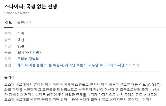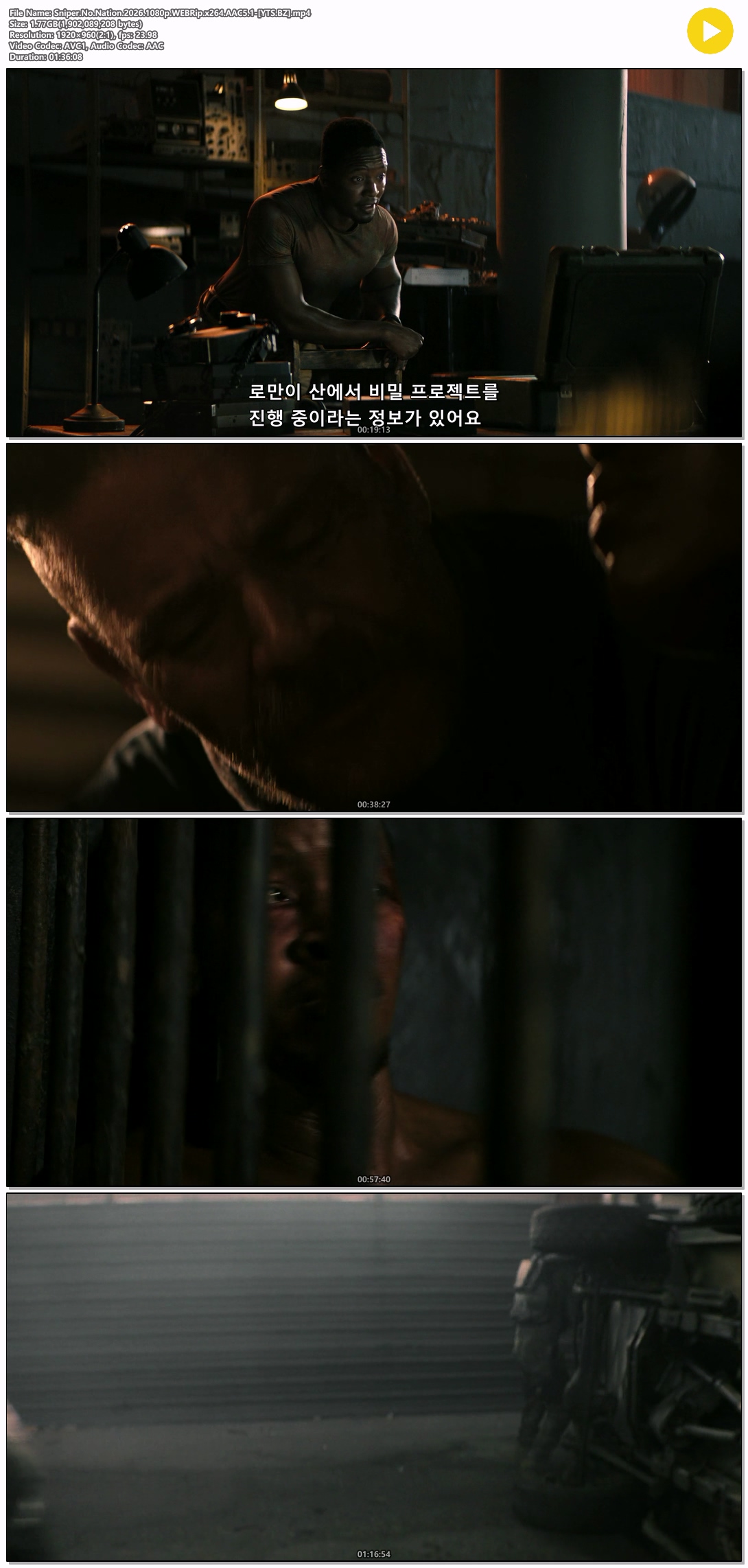 movie 영화 영화 액션 스나이퍼 [영화-액션] 스나이퍼- 국경 없는 전쟁.Sniper.No.Nation.2026.1080p.한글자막 person정용*** calendar_today2026.04.22 visibility3,806 download 다운로드 2개 파일 folder_zip Sniper.No.Nation.2026.1080p.WEBRip.x264.AAC5.1-[YTS.BZ].mp4 1.8 GB download folder_zip Sniper.No.Nation.2026.1080p.WEBRip.x264.AAC5.1-[YTS.BZ].srt download