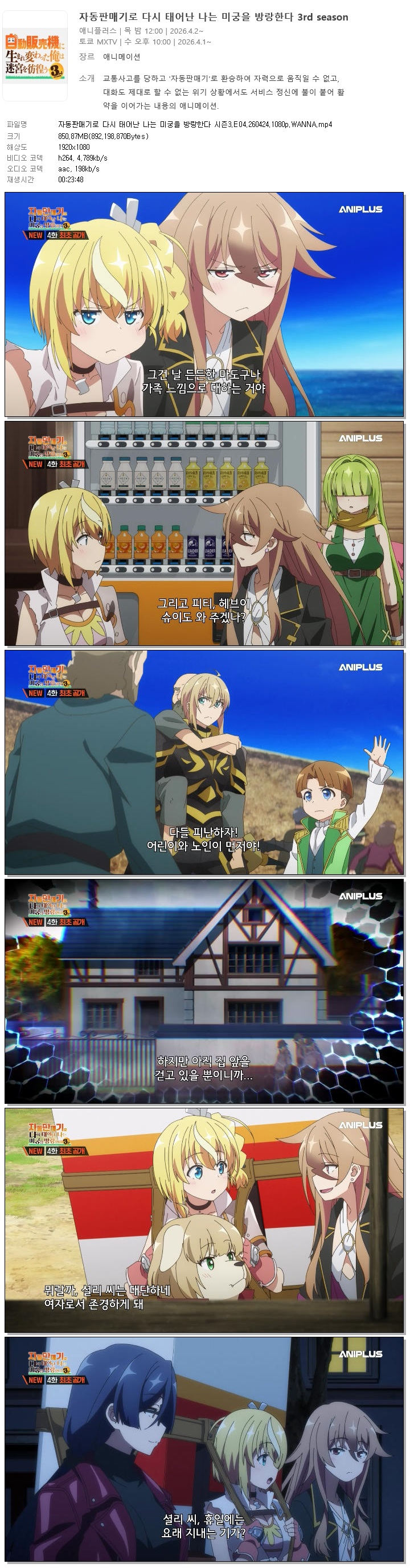 animation 애니 자동판매기로 다시 태어난 자동판매기로 다시 태어난 나는 미궁을 방랑한다 시즌3.E04.260424.1080p.WANNA person홀리*** calendar_today2026.04.23 visibility4,911 download 다운로드 1개 파일 folder_zip 자동판매기로 다시 태어난 나는 미궁을 방랑한다 시즌3.E04.260424.1080p.WANNA.mp4 851 MB download