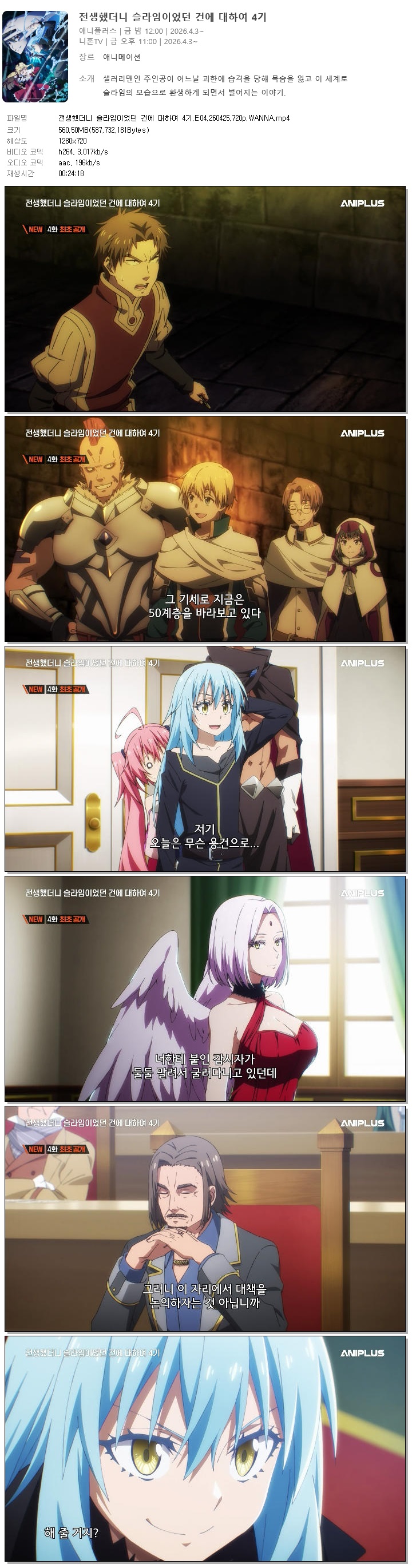 animation 애니 전생했더니 슬라임이었던 건에 전생했더니 슬라임이었던 건에 대하여 4기.E04.260425.720p.WANNA person바오*** calendar_today2026.04.25 visibility7,712 download 다운로드 1개 파일 folder_zip 전생했더니 슬라임이었던 건에 대하여 4기.E04.260425.720p.WANNA.mp4 561 MB download