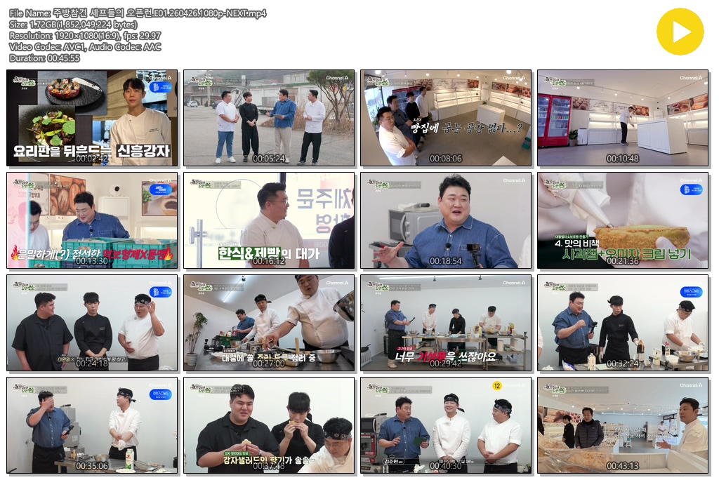 cast 동영상 주방참견 셰프들의 오픈런 주방참견 셰프들의 오픈런.E01.260426.1080p-NEXT personse*** calendar_today2026.04.27 visibility4,591 download 다운로드 1개 파일 folder_zip 주방참견 셰프들의 오픈런.E01.260426.1080p-NEXT.mp4 1.7 GB download