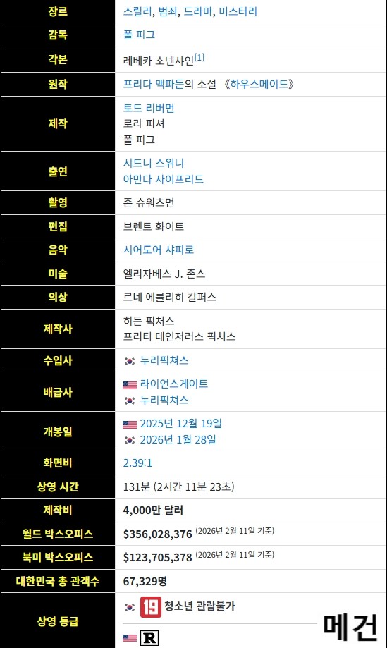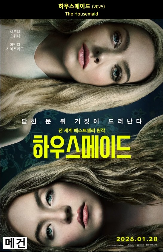 movie 영화 하우스메이드 The Housemaid [하우스메이드] The Housemaid. 2025 (시드니 스위니, 아만다 사이프리드) person메건*** calendar_today2026.04.25 visibility3,308 download 다운로드 1개 파일 folder_zip 하우스 메이드. 2025 (파일, 제목, 스샷 도용 금지!! 작성자 메건).mkv 3.4 GB download