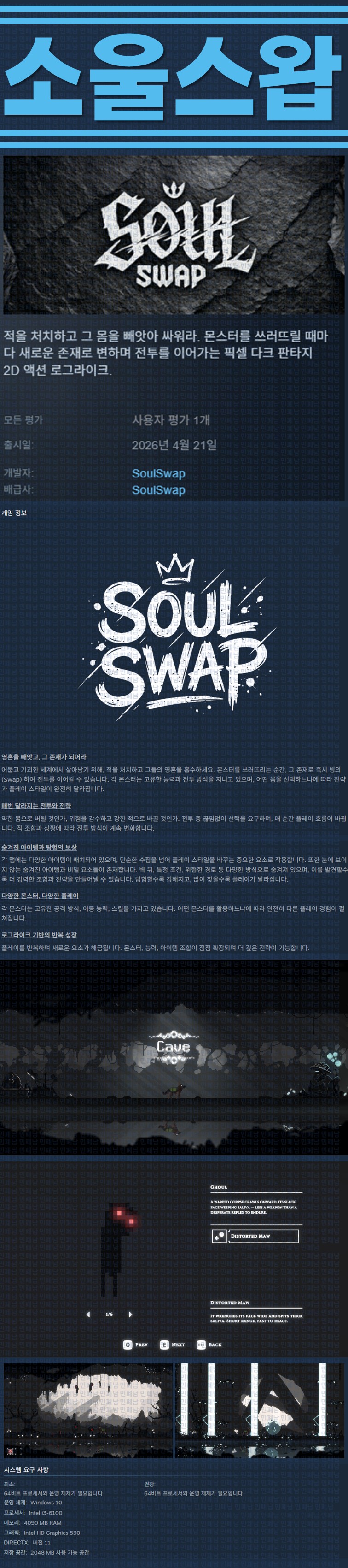 sports_esports 게임 한글무설치 소울스왑 v20260421 [한글무설치] 소울스왑 v20260421 personze*** calendar_today2026.04.24 visibility7,942 실행SoulSwap.exe26.04.21 신작 이지크립트:0000 download 다운로드 1개 파일 folder_zip SoulSwap Build.22830225.zip.ezc 335 MB download
