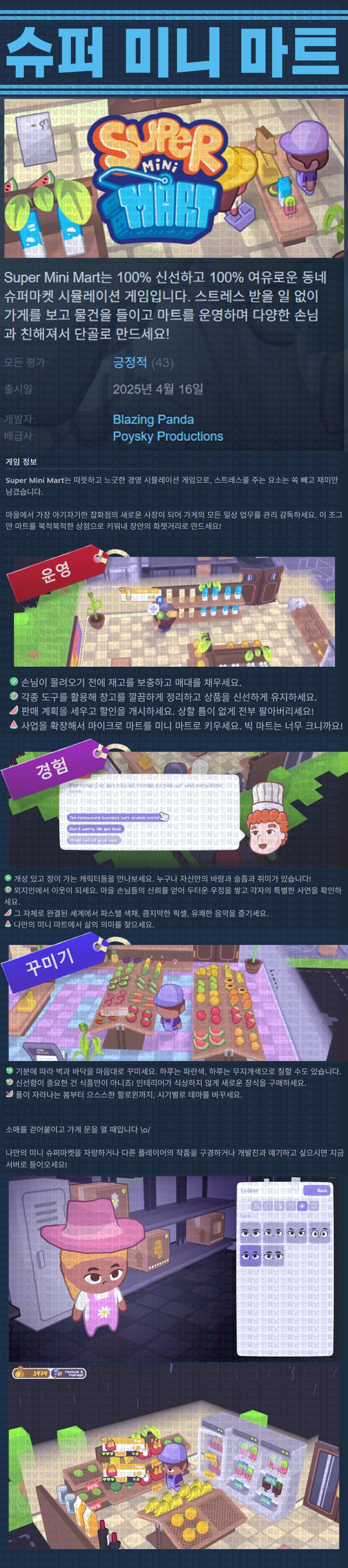 sports_esports 게임 한글무설치 슈퍼 미니 [한글무설치] 슈퍼 미니 마트 v0.7.3 personze*** calendar_today2026.04.25 visibility5,849 실행Super Mini Mart.exe 26.04.23 update이지크립트:0000 download 다운로드 1개 파일 folder_zip Super Mini Mart.zip.ezc 79 MB download