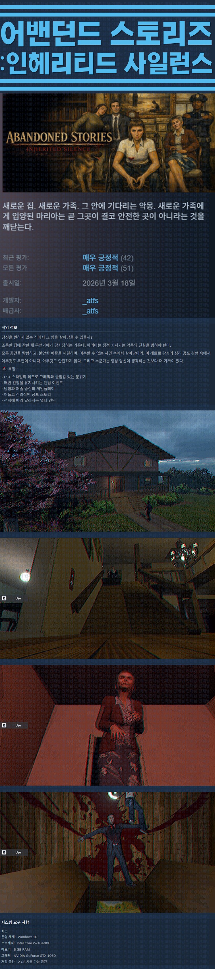 sports_esports 게임 한글무설치 어밴던드 스토리즈 [한글무설치] 어밴던드 스토리즈 인헤리티드 사일런스 v20260415 personze*** calendar_today2026.04.20 visibility5,613 실행Abandoned Stories Inherited Silence.exe26.04.15 update 이지크립트:0000 download 다운로드 1개 파일 folder_zip Abandoned Stories Inherited Silence.zip.ezc 866 MB download