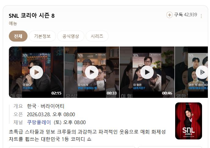 cast 동영상 SNL코리아 시즌8 E01 1080p SNL코리아 시즌8 E01-E04 19금1 탁재훈 고아성 송지효 이미숙 person하늘*** calendar_today2026.04.20 visibility3,371 download 다운로드 1개 파일 folder_zip 1080p SNL 코리아 리부트 시즌8 E01-E04 19금1 탁재훈 고아성 송지효 이미숙.mp4 6.1 GB download