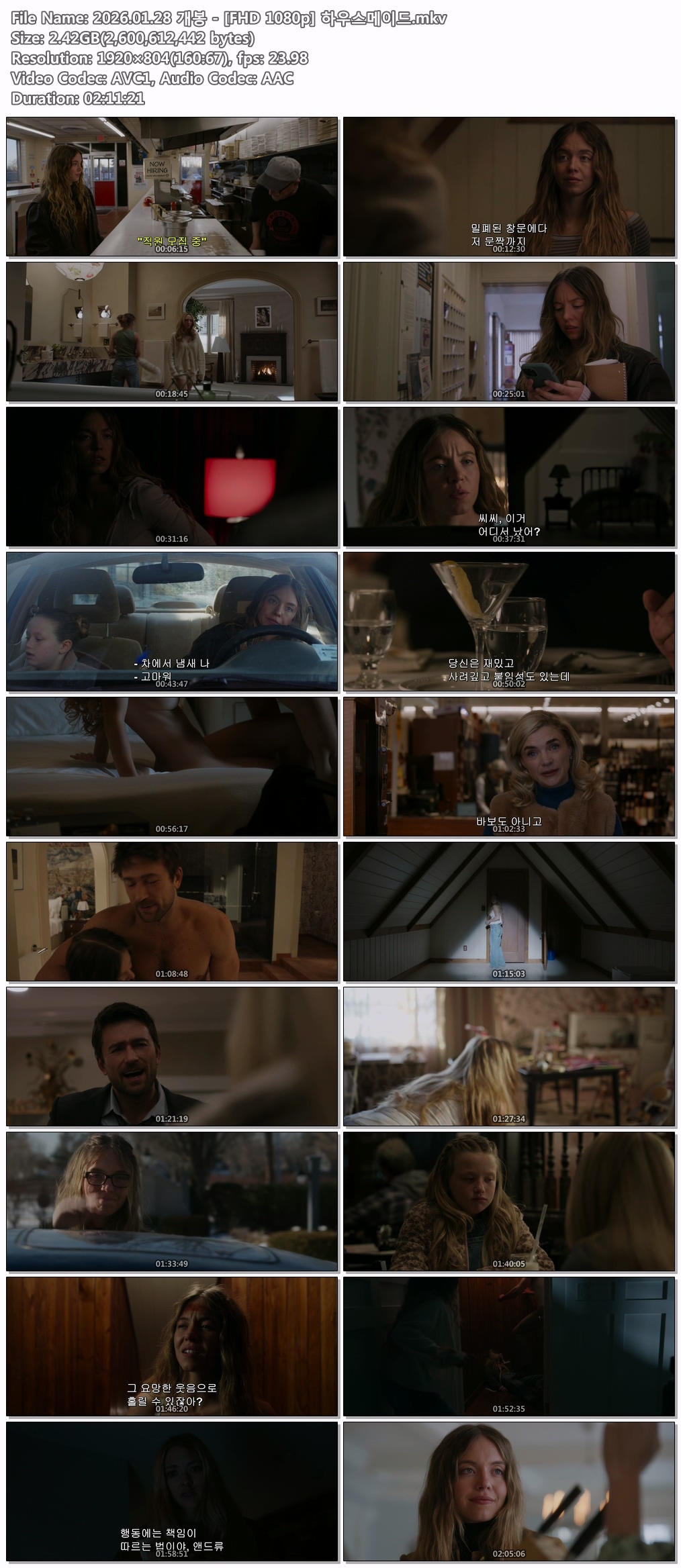 movie 영화 개봉 FHD 하우스메이드 2026.01.28 개봉 - [FHD 1080p] 하우스메이드 person07*** calendar_today2026.04.21 visibility6,693 download 다운로드 2개 파일 folder_zip 2026.01.28 개봉 - [FHD 1080p] 하우스메이드.mkv 2.4 GB download folder_zip 2026.01.28 개봉 - [FHD 1080p] 하우스메이드.smi download
