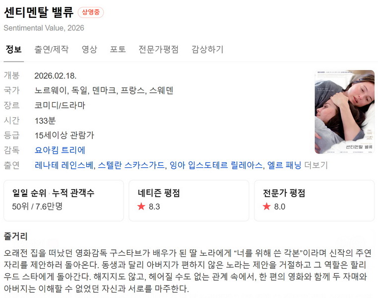 movie 영화 Sentimental Value 한글자막 Sentimental Value 2025 한글자막 person로망*** calendar_today2026.04.27 visibility3,510 download 다운로드 2개 파일 folder_zip Sentimental Value 2025 2160p.mkv 14.3 GB download folder_zip Sentimental Value 2025 2160p.srt download